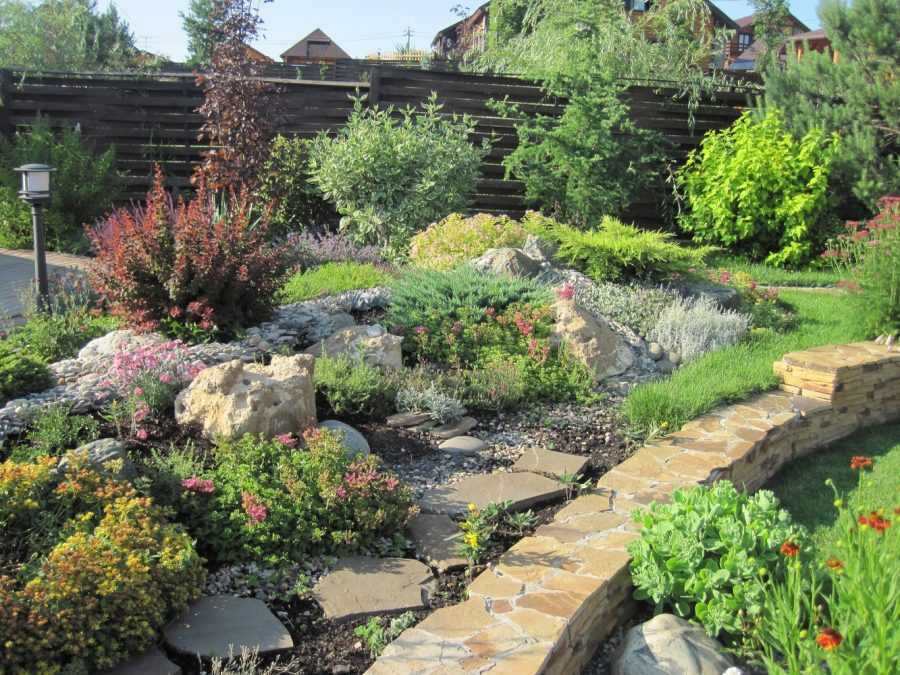 В последнем случае забор маскируют высокими хвойными деревьями или кустарниками, вьющимися растениями или каменной кладкой. Хуже всего рокарий смотрится на фоне полюбившихся дачникам заборов из профнастила.