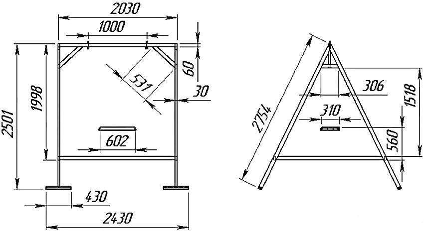 Как уже говорилось, необходимо определиться со схемой – А-образная, Л-образная (без перемычек), П-образная, Г-образная (с консольным расположением балки для подвеса сидения). После этого определяется положение опор – на грунте или в нем. В первом случае необходимо соединить стойки в жесткую призматическую конструкцию на уровне земли, во втором – увеличить длину опор на величину заглубления (обычно 50…80 см).