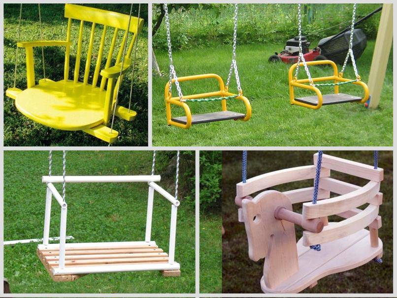 Фантазия умельцев безгранична, и практических вариантов исполнения «сидушки» — бесчисленное множество. Оригинально и функционально применение старого стула. Каркас из металлических труб в сочетании с основанием из фанеры будут служить долго. Обрезки пластиковых водопроводных труб – простое и бесплатное решение. Конек-горбунок с глубокой посадкой никогда не сбросит с себя своего седока. Сидение для маленьких подвешивают на шнурах, цепи подойдут для качелей подростков, и абсолютную надежность обеспечивают металлические трубы.