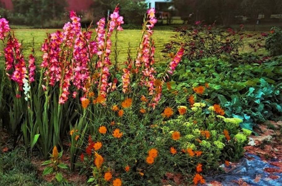 При проектировании ландшафтного дизайна задействуют большое количество растительности. Одни виды служат обрамлением, другие выступают в качестве акцента. Гладиолусам на клумбе всегда отводится главенствующая роль. Но чтобы композиция смотрелась гармонично, царственному цветку требуется свита, в которой рекомендуется использовать менее выразительные экземпляры.