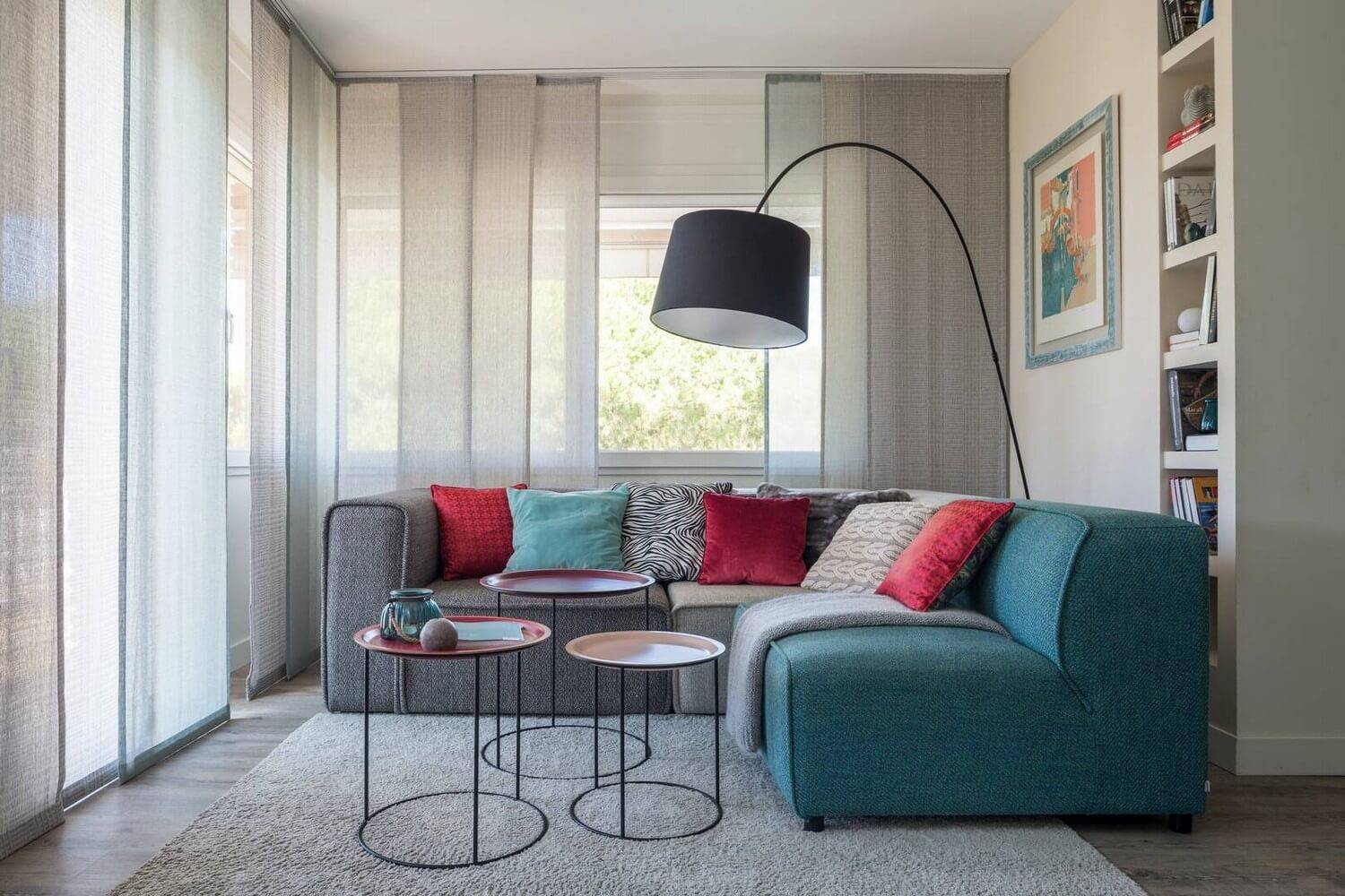 Проект квартиры в Барселоне. Нейтральные шторы соседствуют с яркой обивкой мебели и диванными подушками сочных оттенков