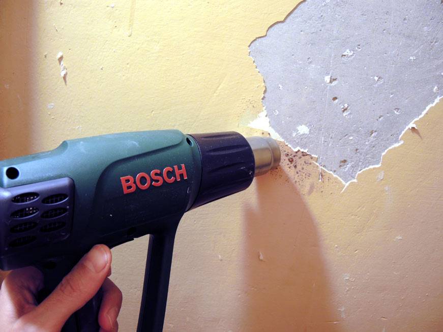 - Направить струю горячего воздуха на окрашенную стену, выдержать время, необходимое для размягчения и снятия старых слоев.