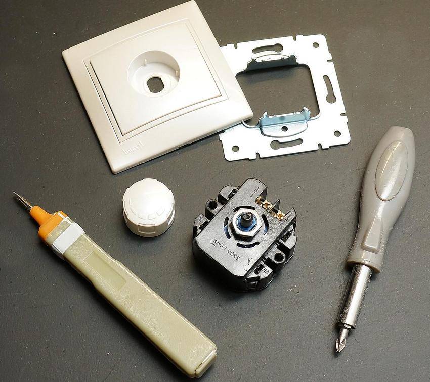 Самая простая, так как речь здесь идет о монтаже регулятора вместо традиционного выключателя. Для начала клавишный переключатель следует демонтировать (разумеется, заранее его обесточив). Для этого снимается крышка клавиши обесточенного приспособления – именно под ней располагаются фиксирующие корпус винты. В отсутствие пластиковой коробочки ее в обязательном порядке необходимо установить после демонтажа размыкателя. Это может быть и простая коробка – такая, что применяется для розеток.