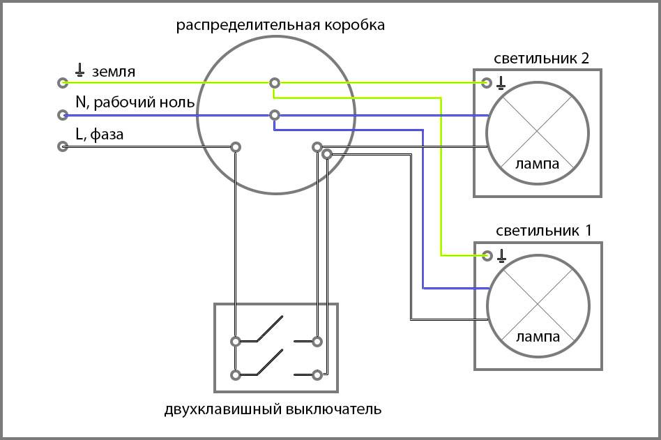 Внимательно изучите представленную схему – нас интересуют серые линии, обозначающие фазу. Сразу становится понятным, что именно они тянутся к двухклавишному выключателю. Это очень важный момент, так как некоторые электрики не соблюдают этого правила и пускают туда нуль.