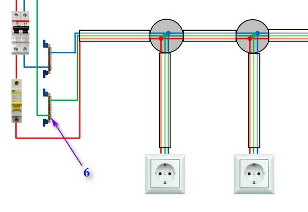 Схема подключения одиночных розеток к однофазной сети с контуром заземления