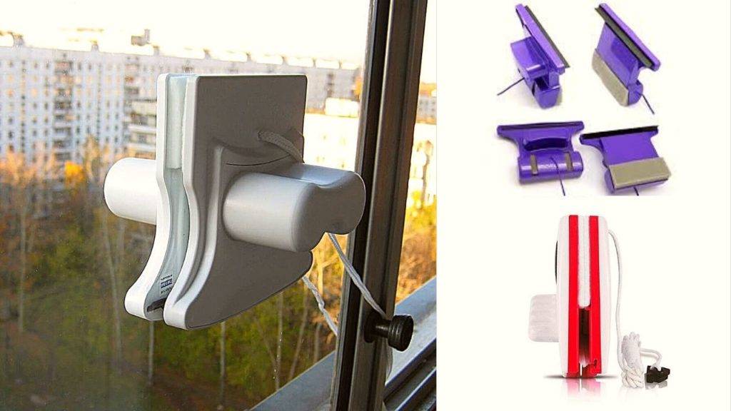 - Двусторонняя щетка на магнитных держателях. Одна часть щетки крепится с одной стороны стекла, вторая – с другой, за счет магнита они держатся и передвигаются с помощью ручки одновременно, очищая окно сразу с двух сторон;