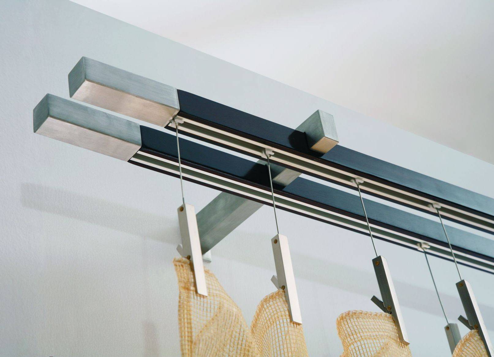 - Струнные. Широко использовались в советское время. Представляют собой тонкий стальной трос, натянутый между двумя кронштейнами. Это наиболее бюджетный вариант, который в последнее время используется очень редко. Выглядят данные модели минималистично. Они практически не видны и не занимают много пространства. Для классических интерьеров они простоваты, но могут с успехом вписаться в современный стиль.