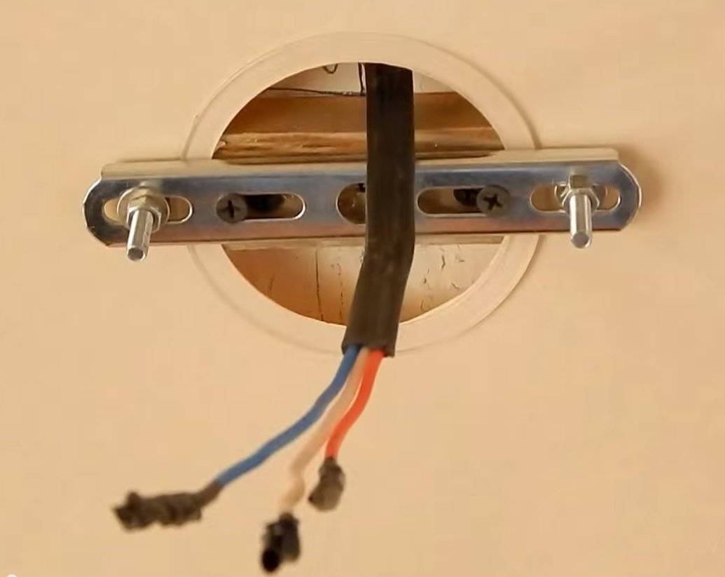 Когда подготовлены крепежи, люстру нужно подсоединить к сети. Посредством предварительно сделанного отверстия через термокольцо протягивают наружу провода. Светильник подвешивают на планку или крюк, чтобы освободить руки, и подключают проводку.
