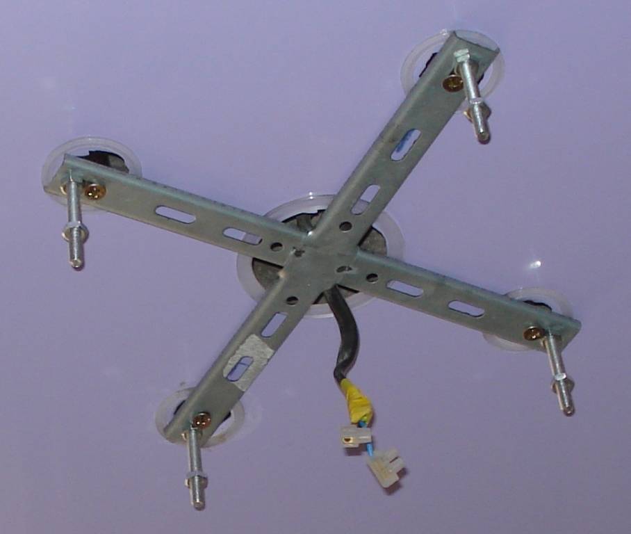 - К основному потолку прикрутите несущую платформу. Она должна быть пропорциональна размерам крестовины. В этой платформе следует высверлить отверстие для электропроводки. Для выведения платформы под высоту полотна используйте металлические «ножки».