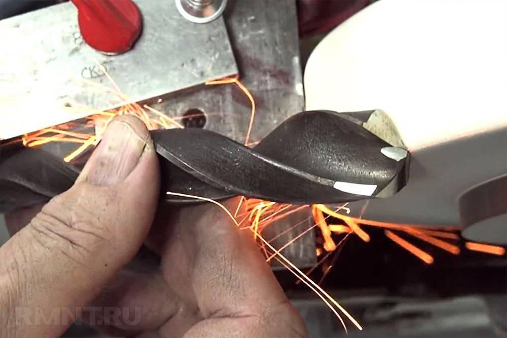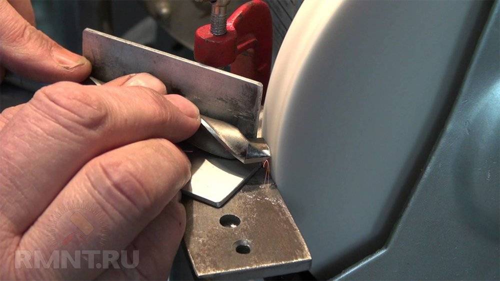 При заточке сверло устанавливается на подручник так, чтобы его режущая часть была немного приподнята. Проворачивая сверло и сдвигая хвостовик влево, нужно добиться, чтобы режущая кромка расположилась строго горизонтально и параллельно торцу круга. Затачивать левую и правую кромку нужно поочерёдно, снимая тонкий слой металла и периодически охлаждая сверло в воде.