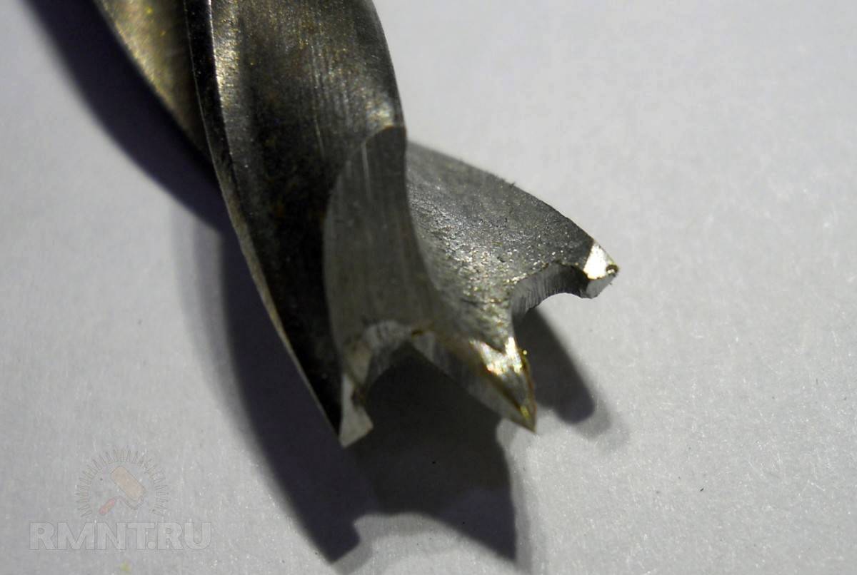 В таких ситуациях лучше использовать сверло перьевого типа, имеющее центрирующий носик. Изготовить такое можно из обычного сверла по металлу, переточив его определённым образом. Всё делается так же и с теми же углами, но при этом кромки не развёрнуты от вершины к краям, а сведены навстречу друг другу. Перьевое сверло нужно затачивать о край камня, оставляя перемычку нетронутой. Стачивание кромок выполняется до тех пор, пока перемычка не образует носик, выступающий над вершинами режущей части на 1–2 мм.