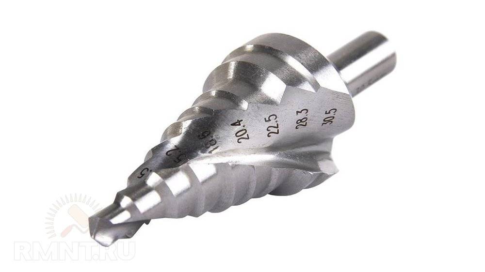 Третий вид свёрл по металлу — конусные ступенчатые. У них есть несколько режущих кромок различного диаметра, что позволяет проделывать разные по размеру отверстия всего одним инструментом. Однако, несмотря на кажущуюся универсальность, найти действительно хорошее ступенчатое сверло довольно сложно, а его стоимость составит не менее $25. Другой минус — заточку таких свёрл можно выполнить только на специализированном станке.