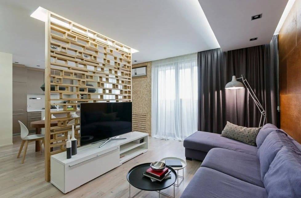 - многочисленными идеями про перегородки – к примеру, раздвижные могут заменить монолитные стены, а локацию мобильных вариаций легко менять в зависимости от потребностей жильцов. Шторы – универсальный вариант, незагромождающий пространство, их легко внедрить в любой дизайн интерьера;