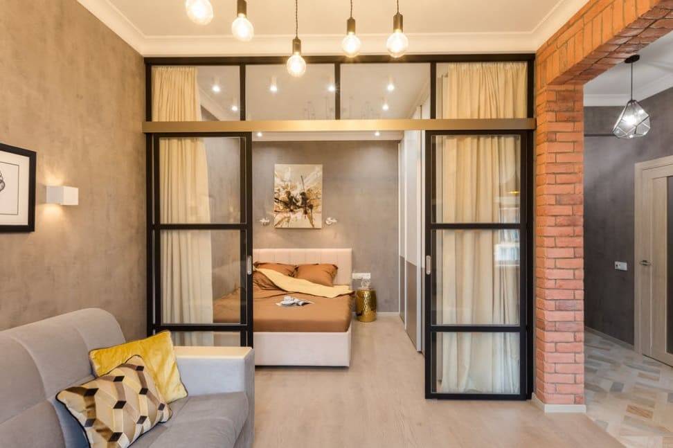 - провести зонирование мебелью, раздвижными дверьми, шторами и т.д. В итоге можно получить две полноценные и уединенные комнаты, но при этом не иметь проблем с документами на квартиру;