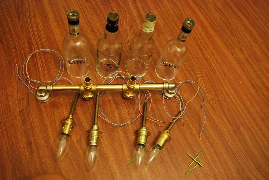 Подвесная люстра из бутылок, которую я решил выполнить, в своем основании будет иметь удлиненные емкости. Процесс изготовления получится примерно следующим: