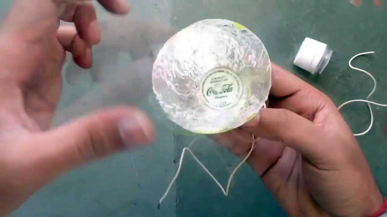 - Продеть леску или проволоку в бусину, концы соединить. Бусину поместить на середину проволоки и немного перекрутить проволоку возле бусины. Концы проволоки продеть вначале через отверстие на дне бутылки, а затем через отверстие в крышке. Крышку завинтить.