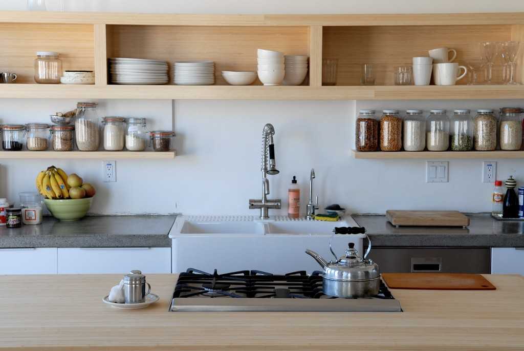 Открытые полки на кухне легче всего сделать из дерева. Это может быть универсальная конструкция, которую можно будет закрепить на стену, установить на стол или на пол.