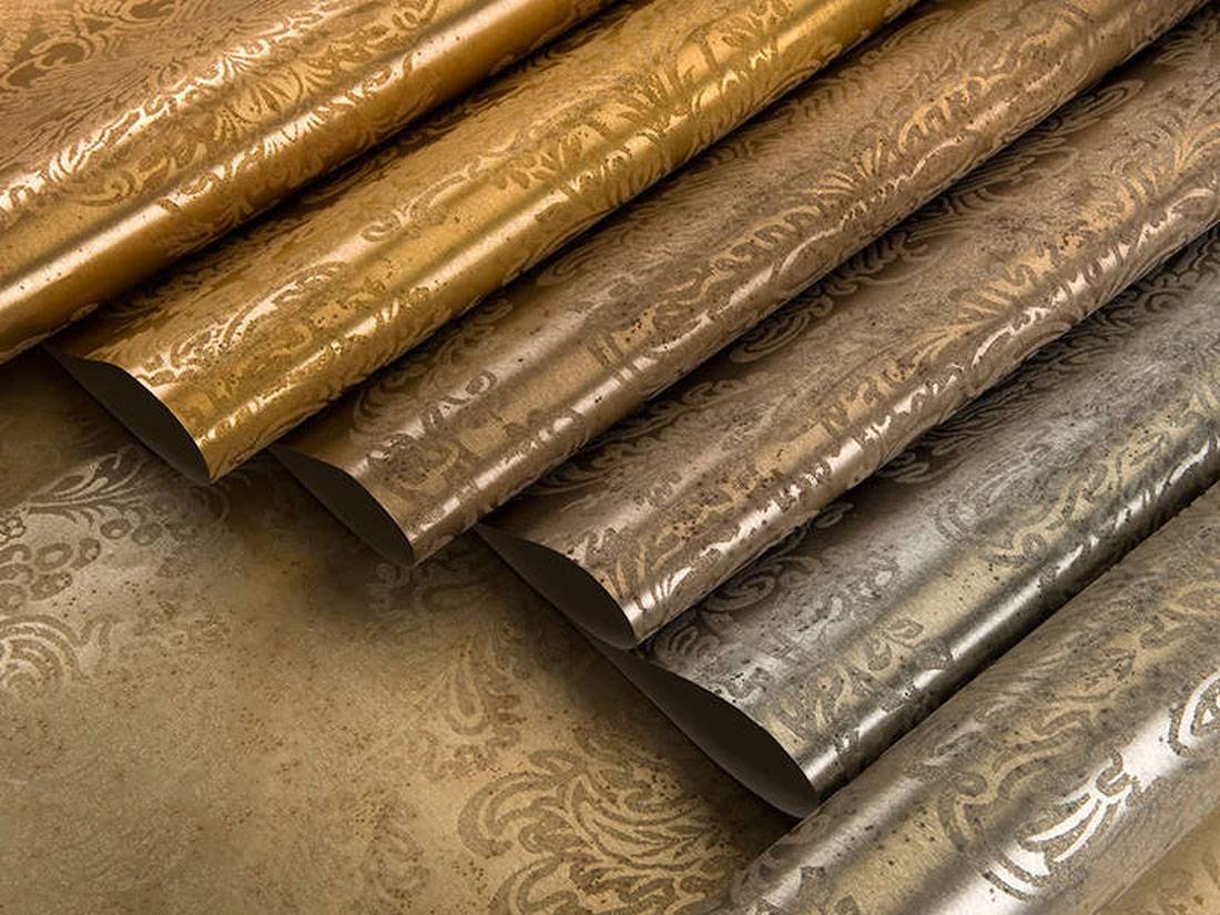 Обои данного типа состоят из двух слоев — бумажной или флизелиновой основы и алюминиевой фольги. В зависимости от дизайнерской задачи, фольга может дополнительно окрашиваться, покрываться глянцевым напылением, украшаться тиснениями и узорами, благодаря чему изделие выглядит очень ярко, стильно и оригинально. Однако интересный внешний вид — это далеко не единственное достоинство металлизированных обоев.