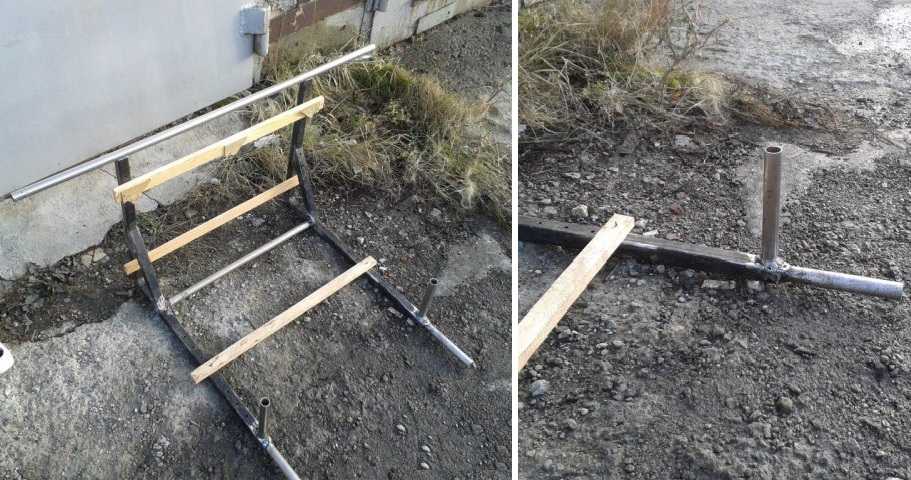 На схеме нет угловых упоров, они сделаны «на глаз». Угол — около 50°. Далее дело за малым — сварить. При помощи инверторного сварочного аппарата это не слишком сложно. Тем более что труба имеет толстую стенку: 3 мм варится нормально.