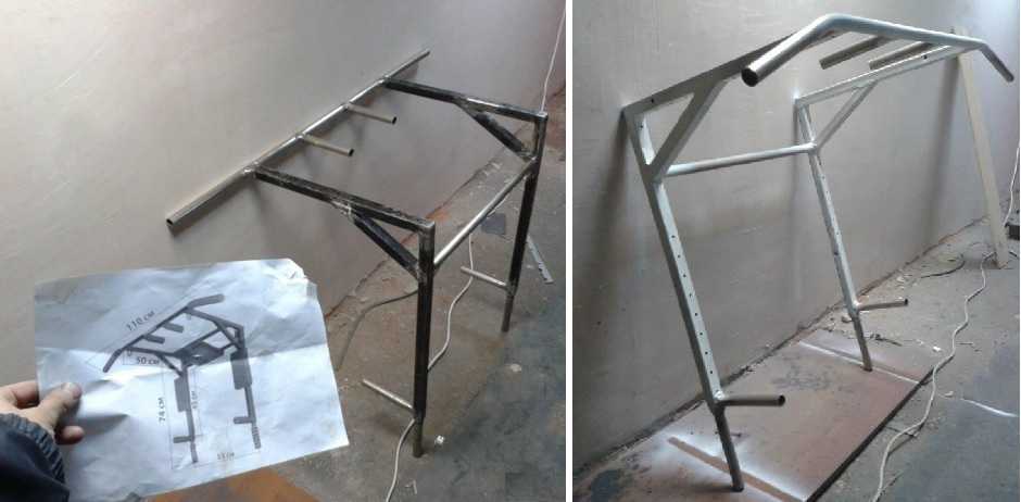По опыту эксплуатации: крюки на стену стоит делать длиннее, под три дюбеля как минимум. И еще: конструкция была доработана — ручки для узкого хвата в том варианте, что на картинке, неудобны, поэтому приварена еще одна перекладина.