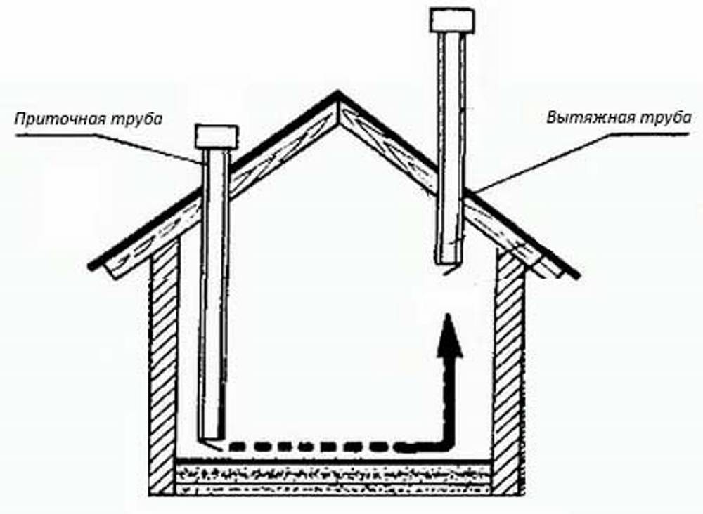 Данный вид входит в группу естественной вентиляции, но тут делают специальные воздуховоды. Понадобится строительство двух труб. Воздуховод, отвечающий за вытяжку, обустраивают в области потолка, а затем выводят на улицу. Приточная труба также располагается над крышей на высоте не более 40 см. Во внутренних помещениях воздуховоды доходят до полов, но не ближе чем на 30 см.