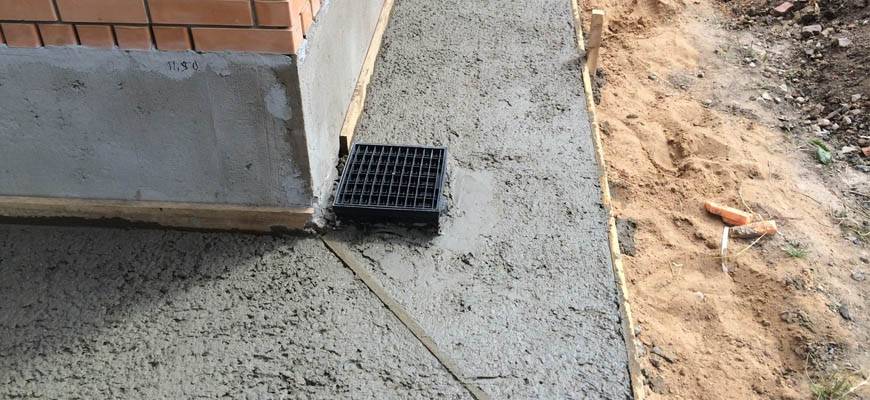 Для формирования желоба можно использовать правило либо воспользоваться канализационной трубой, просто утопив её в растворе вровень с основной поверхностью. Трубу можно разрезать пополам и накрыть сверху решёткой либо оставить целой и подвести её под сливную трубу с крыши. Швы и щели обязательно нужно заделать герметиком.