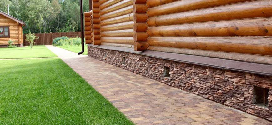 Иногда основание деревянного дома по периметру (по стене) покрывают плиткой или другим материалом, который имеет более высокую прочность и влагоустойчивость. Главное: оставить внутри место для движения древесины и защитить стык сверху от попадания влаги.