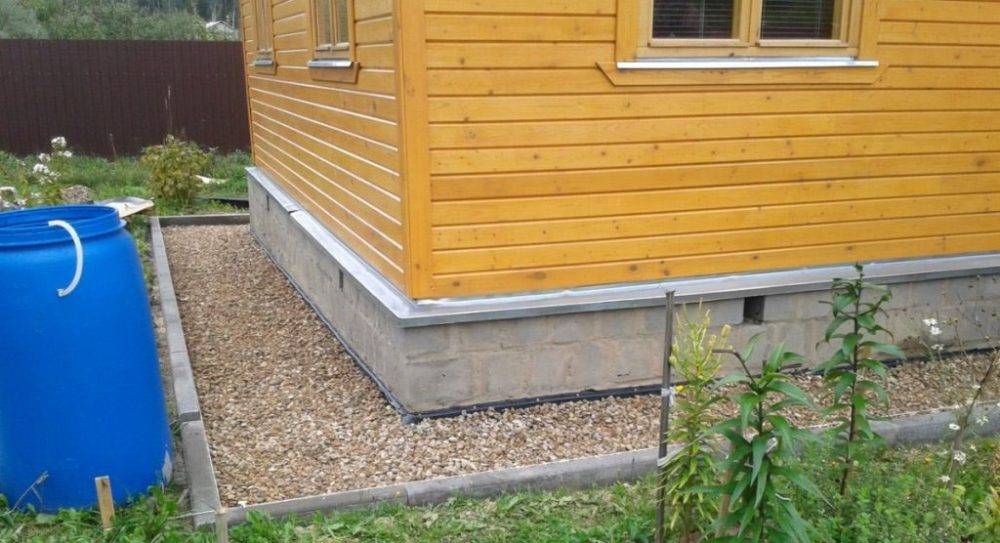 01-83, где сказано, что на нормальных грунтах ее ширина должна быть не менее 600 мм, а на просадочных — не менее метра. В общем случае ширина покрытия должна выходить не менее чем на 200 мм за выступающий срез кровли.