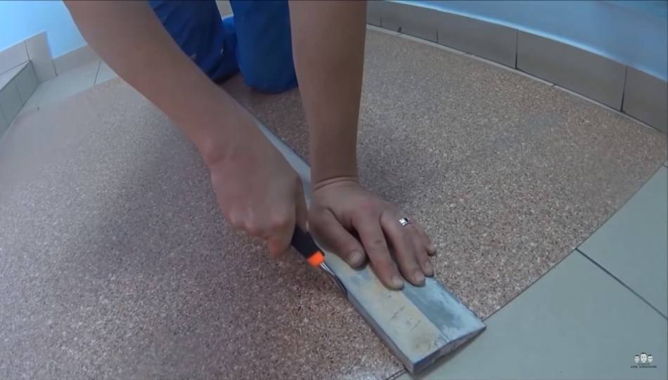 На фотографии удаление излишков с линолеума