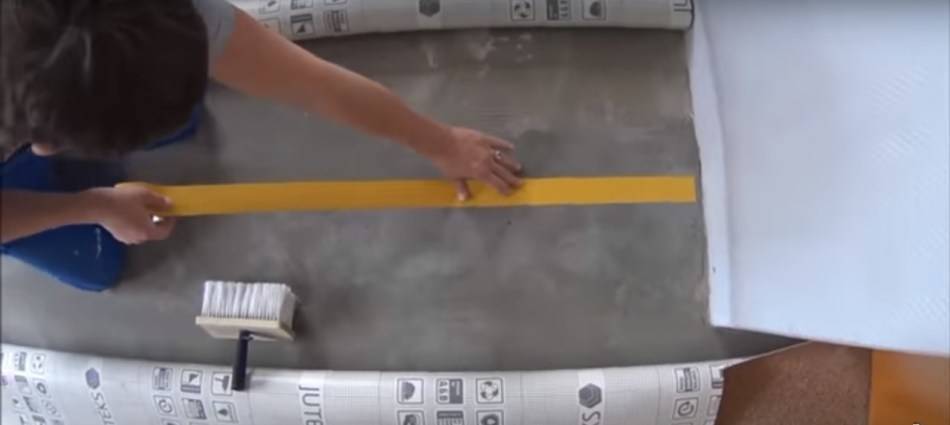 Чтобы приклеить скотч, одно из склеиваемых полотен немного закатывается, а по краю второго рисуется линия карандашом на полу. Затем закатывается и второе полотно. После этого приклеиваем к полу двухсторонний скотч, так чтобы нарисованная линия приходилась посредине полосы скотча.