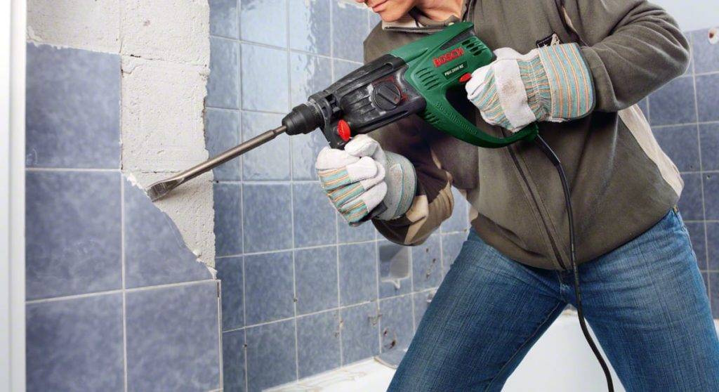 Применение перфоратора значительно ускоряет процесс демонтажа. Правда, в этом случае придется забыть о сохранности плитки – покрытие удаляется раз и навсегда. Из насадок лучше всего выбрать долото – так инструмент будет работать по аналогии с предыдущим способом.