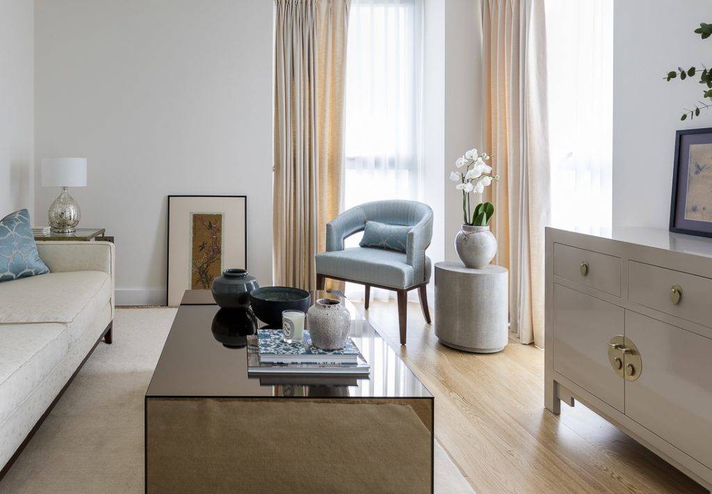 1) Краска цвета слоновой кости наполняет пространство теплотой, спокойствием и уютом. Отражающие поверхности, такие как металлический журнальный столик, были выбраны, чтобы поймать свет и обмануть глаз, расширяя пространство. Подчеркивает этот эффект материалы с блеском или мерцанием, например шелковые шторы.