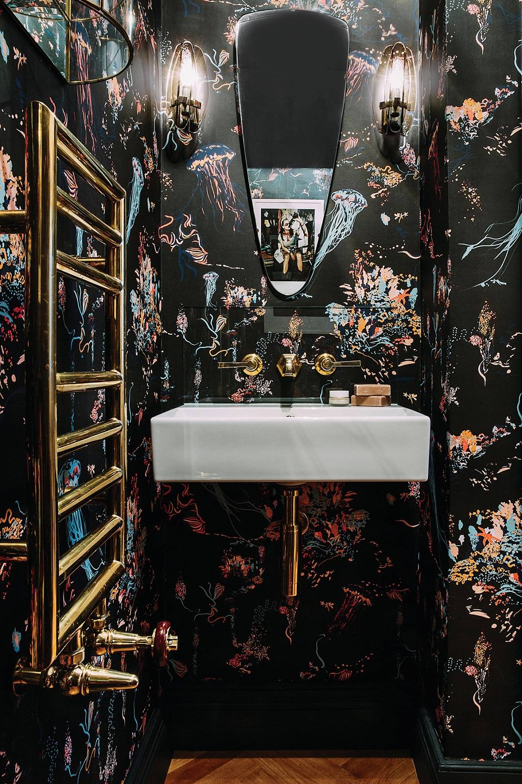Темные обои, латунные детали и зеркало были искусно выбраны из-за их контрастных материалов.
