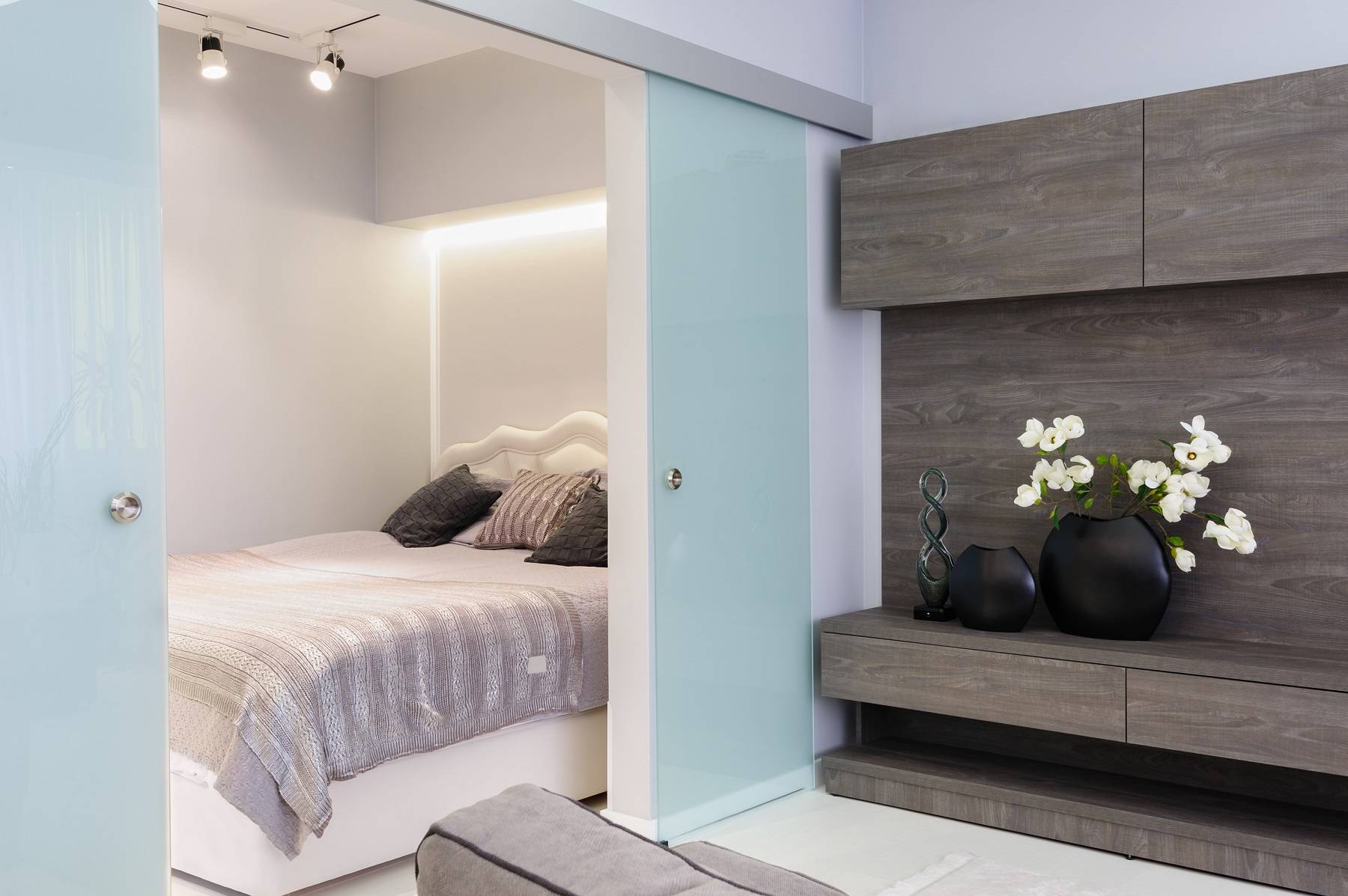 9) Разделение гостиной и спальни с использованием стеклянного экрана обеспечивает легкое и воздухопроницаемое пространство при сохранении эффекта их отдельности. Создается ощущение, что у вас уже две комнаты.