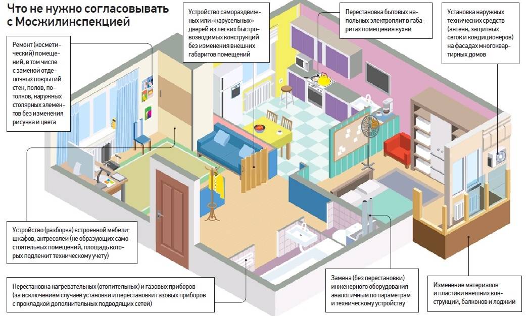 В статье 25 Жилищного кодекса РФ определяется понятие перепланировки и переустройства жилого помещения, а также список тех видов работ, которые не нуждаются в предварительном согласовании с государственными органами и получении специального разрешения на их проведение. Согласно данной статье ЖК РФ: