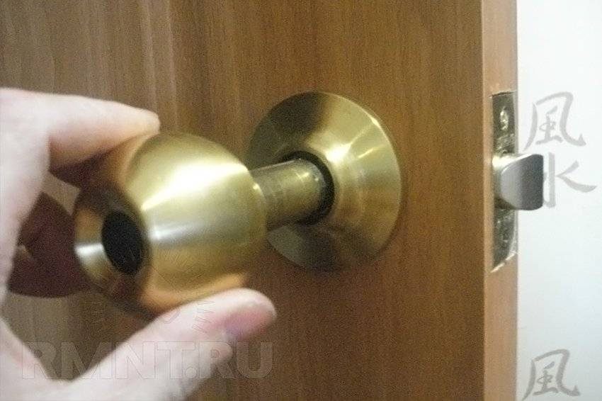 Вначале в отверстие в торце двери вставляем часть замка с запорным язычком. После этого в гнездо, которое должно оказаться по центру первого отверстия, вставляем сердцевину замка с одной из ручек.