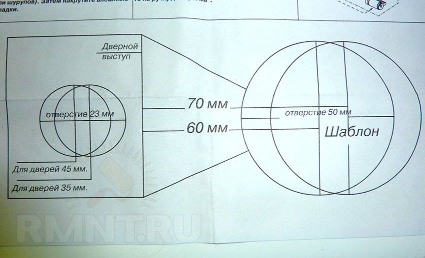 Круглые замки нуждаются в изготовлении двух отверстий. Одно делается в плоскости дверного полотна, другое — перпендикулярно ему, в торце. Качество установки зависит от точности разметки. Большинство замков в комплекте поставки имеют специальный шаблон, который прикладывают к полотну и отмечают центры отверстий.