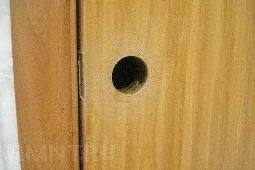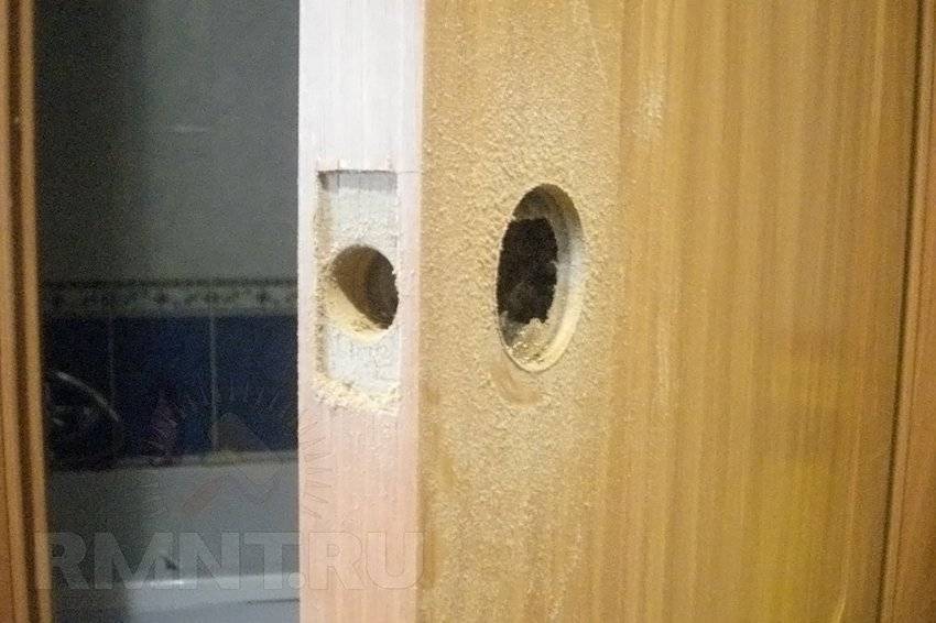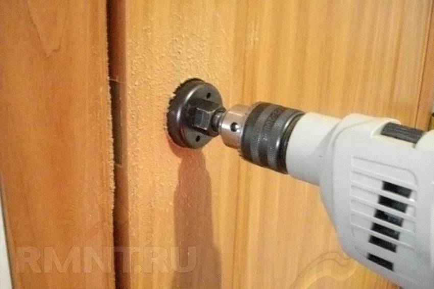 Делается отверстие в плоскости дверного полотна. Если мастер располагает специальным набором, процесс значительно ускоряется и упрощается — по разметке, используя цилиндрическое сверло, вырезают большее отверстие. Если набора нет, приходится выходить из положения с помощью электролобзика, или наметить окружность и высверлить ее по периметру тонким сверлом.