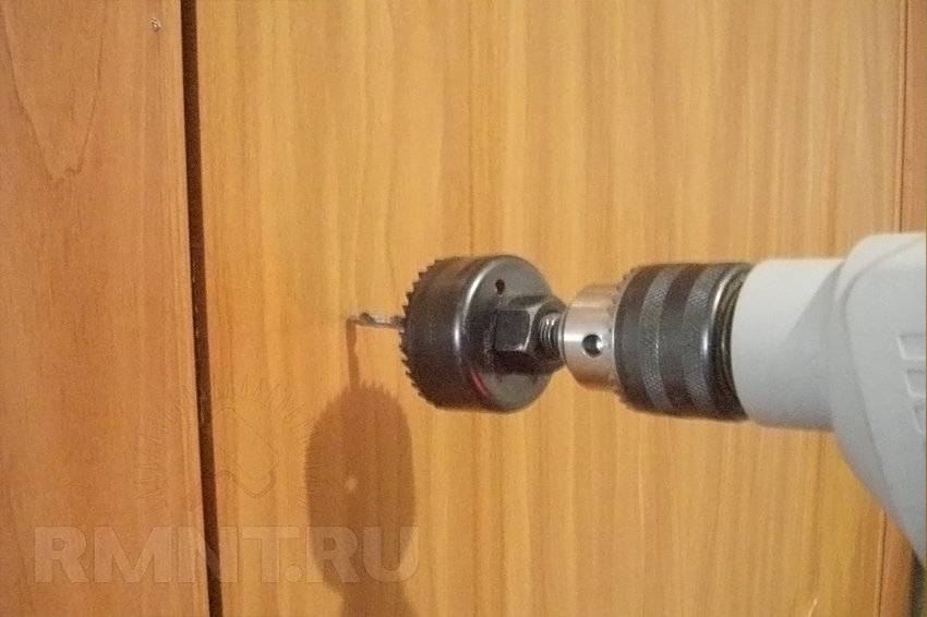 4. На полотне с помощью корончатой фрезы в установленной ранее отметке заготавливается отверстие под ручки.