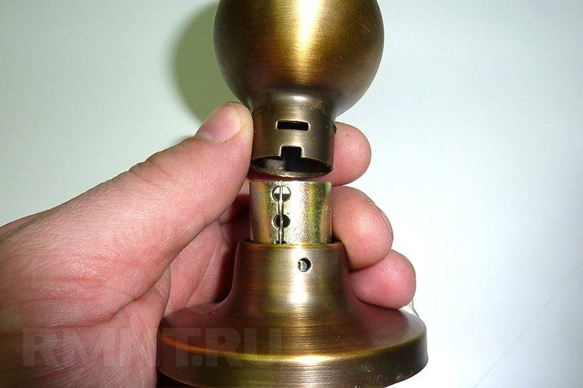 Производят частичную разборку замка — отсоединяют одну из ручек и вставляют в гнездо механизм, одновременно вставляя вторую деталь (язычок) в торцовое отверстие. Совмещают их соединительные элементы так, чтобы при нажатии ручки язычок двигался как положено.