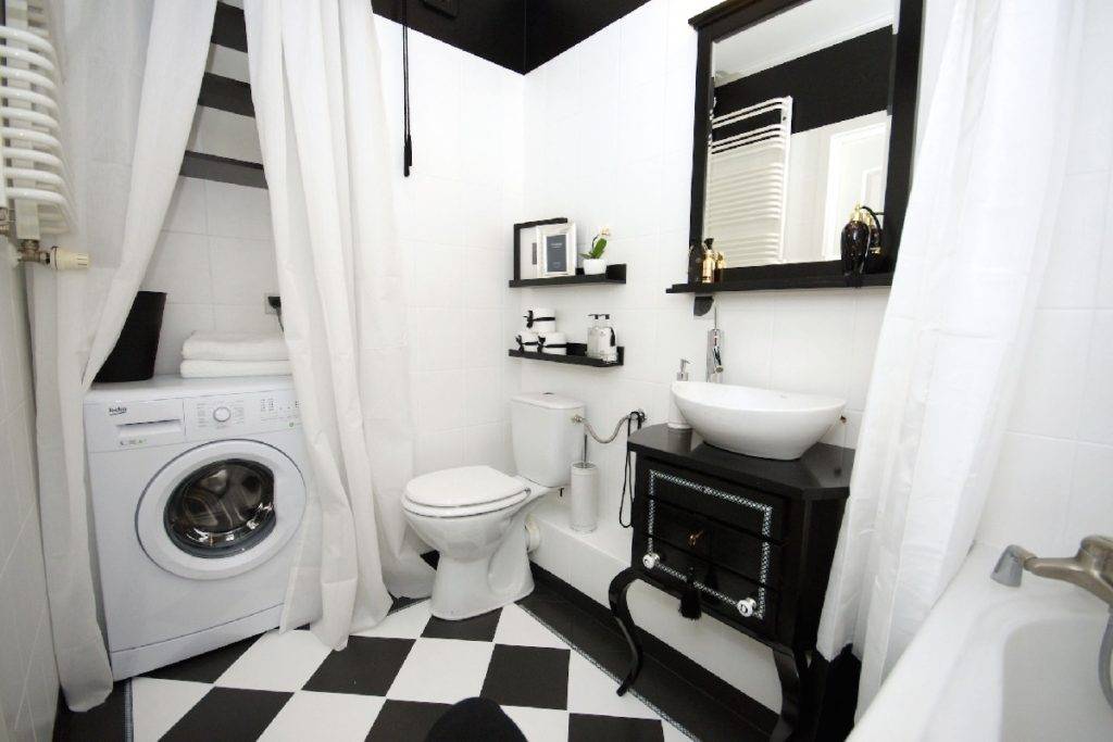 При помощи материала разной цветовой гаммы и фактуры можно удачно разделить комнату на функциональные зоны. Крупные плитки подойдут для пола и стен, более мелкие ограничат хозяйственную зону от гигиенической и от постирочной.