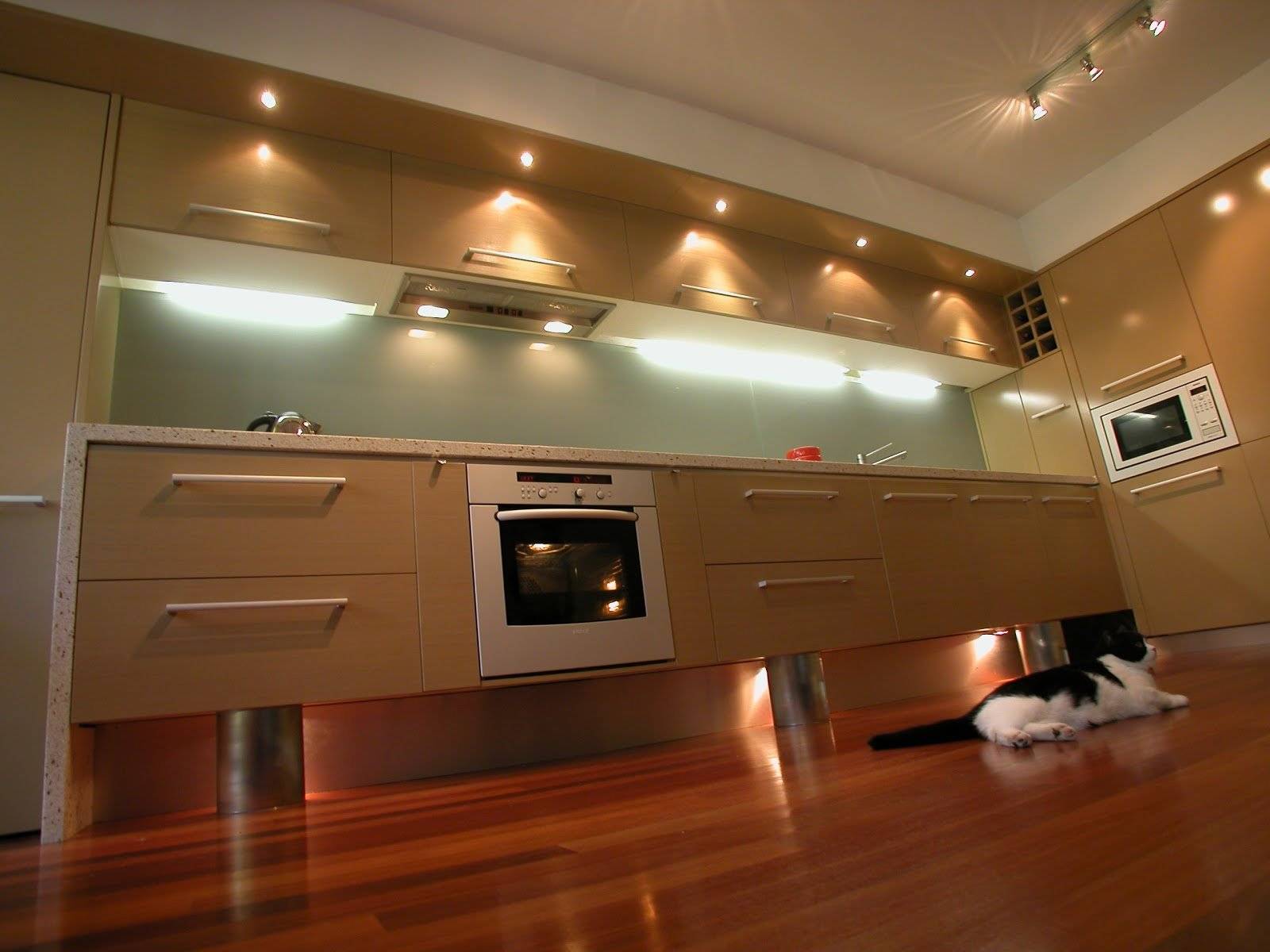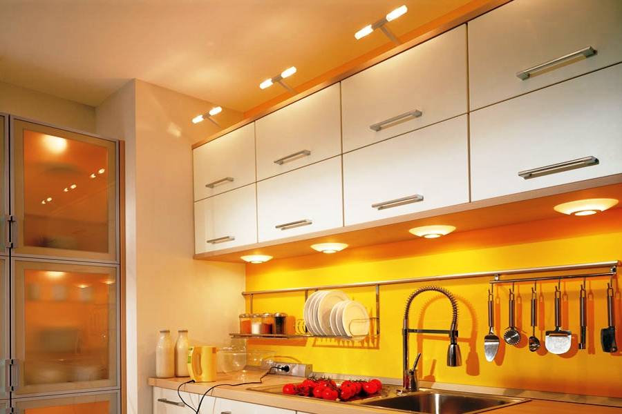 под шкафы – такие светильники имеют отдельный плафон, который содержит набор световых элементов для освещения пространства внутри кухонных шкафов или корпусов шкафов снаружи. Такие плафоны могут быть как встроены в кухонную мебель, так и установлены отдельно в качестве отдельного элемента освещения. При приобретении таких плафонов срок службы составляет более 5 лет;