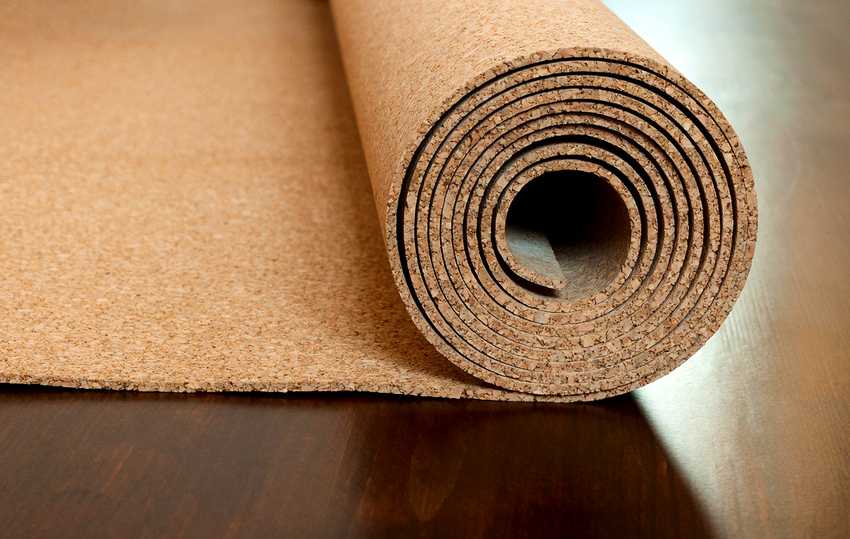 - Пробка — упругая, долговечная, экологичная. Изготавливается из послойных срезов коры пробкового дерева, поставляется в рулонах. Такой вид подложки, подобранный под ламинат соответствующей толщины, уберёт шум до 15дБ. Нельзя использовать с тёплым полом, поскольку пробка боится влаги. Покрытие можно купить как в листах, так и полотном, свёрнутым в рулон. Главный его минус — довольно высокая стоимость.
