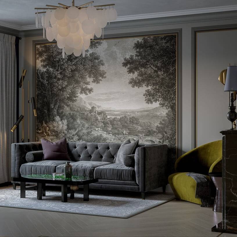 Однотонные геометрические фигуры на темном фоне идеально впишутся в гламурный ретро стиль и станут отличным фоном для предметов мебели, выполненных в классическом стиле.