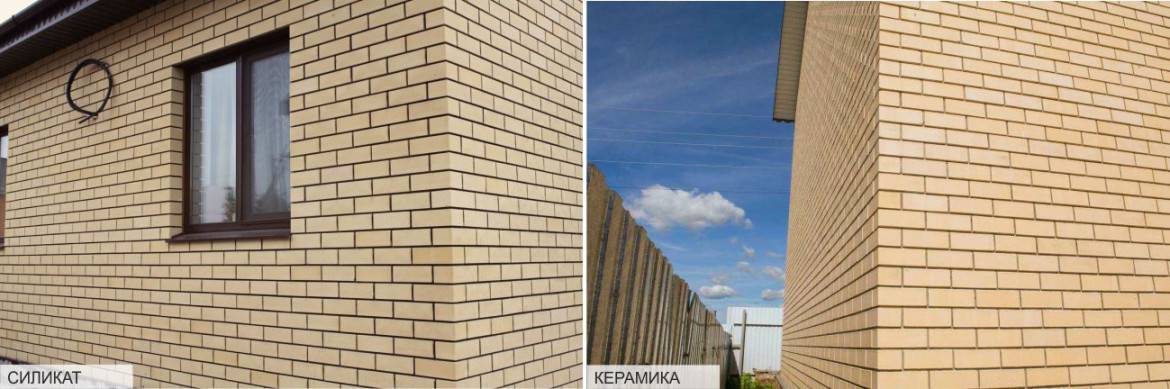 Существует два вида лицевого кирпича: силикатный и керамический. Давайте рассмотрим плюсы и минусы каждого из них. Для верности сравнения возьмем одинарный кирпич желтого цвета, потому что этот цвет самый используемый для украшения фасада.