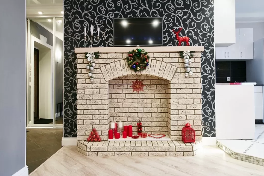 Камин из «красного кирпича» и зеленая ель представляют собой классическую цветовую гамму праздника.