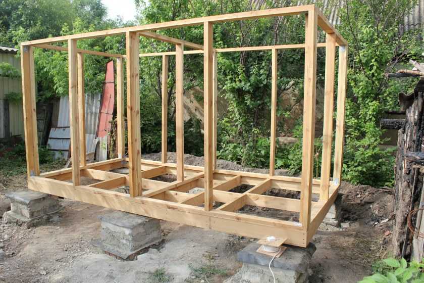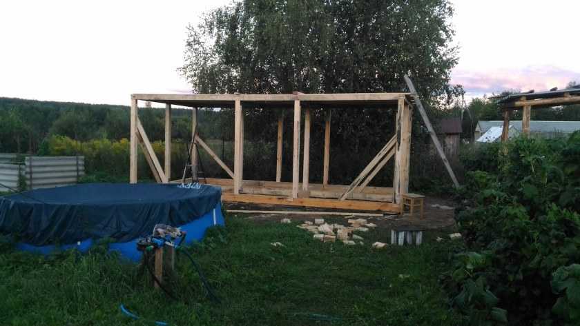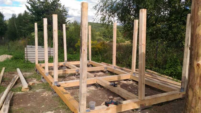 Совет! При сборке опорного каркаса стойки можно укрепить откосами, после обшивки строения OSB-плитой и монтажа кровли откосы убираются.