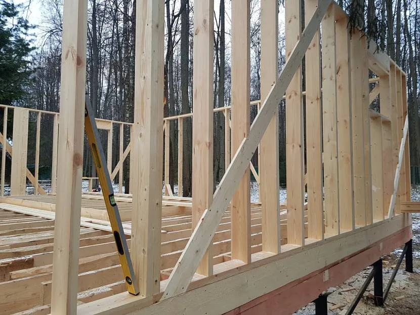 После того, как была произведена обшивка каркасов, укосины убирают. Использование укосов позволяет самому построить каркасный дом на участке, не допустив кривизны стен.