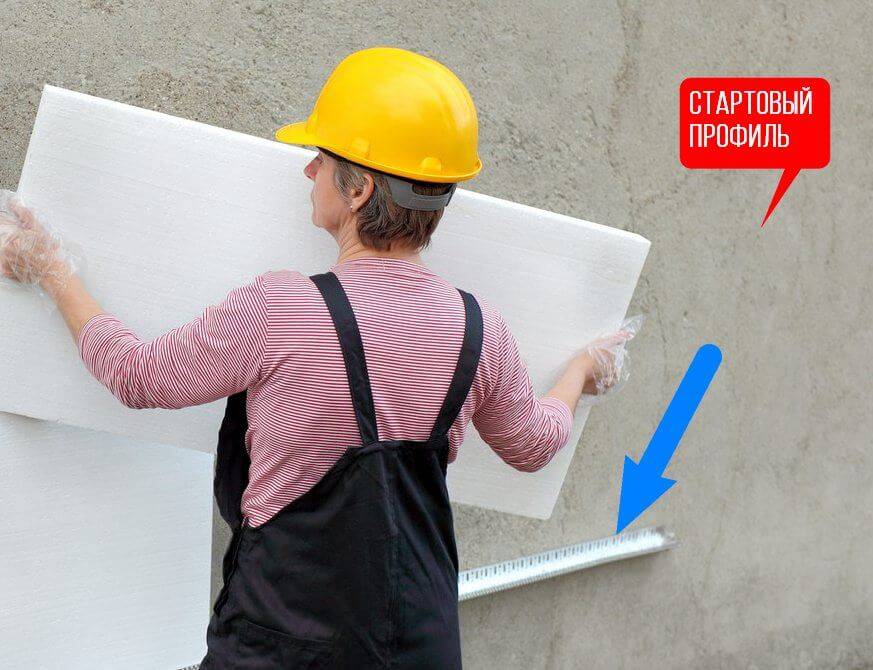 Стены необходимо заранее очистить, если есть необходимость их ровняют. Далее поверхность стены грунтуют. На цоколь с помощью уровня устанавливают стартовую планку, которая будет поддерживать плиту пока клей будет засыхать.