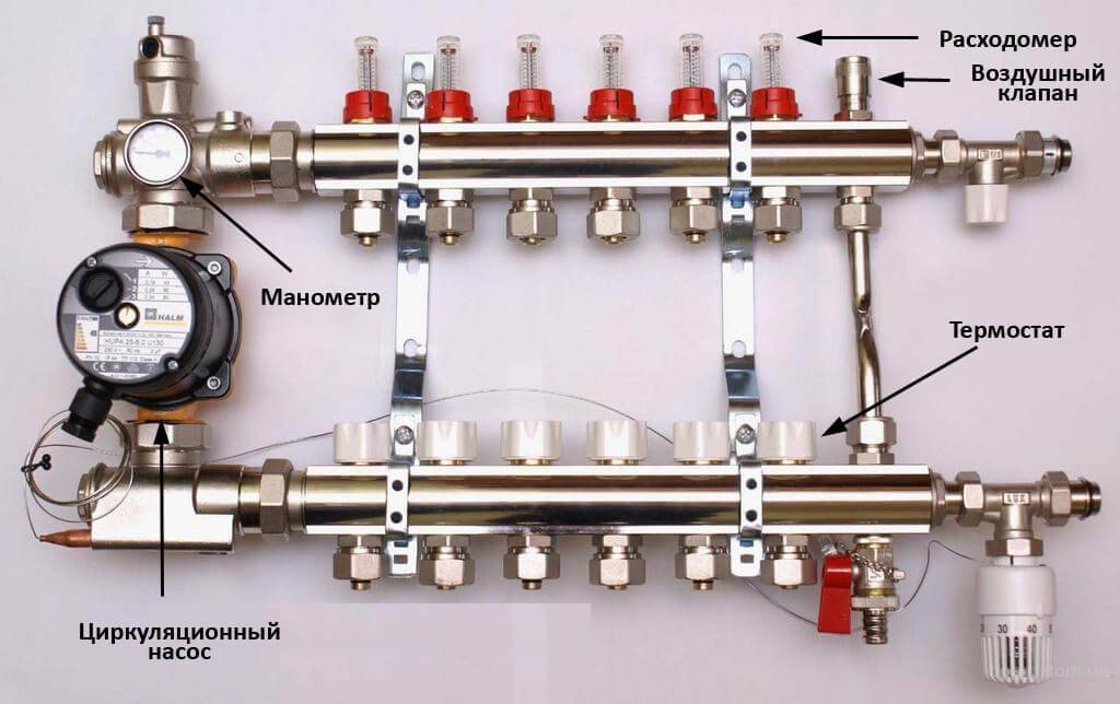 Кроме непосредственно гребенок теплого пола коллекторный узел может включать в себя следующие элементы: